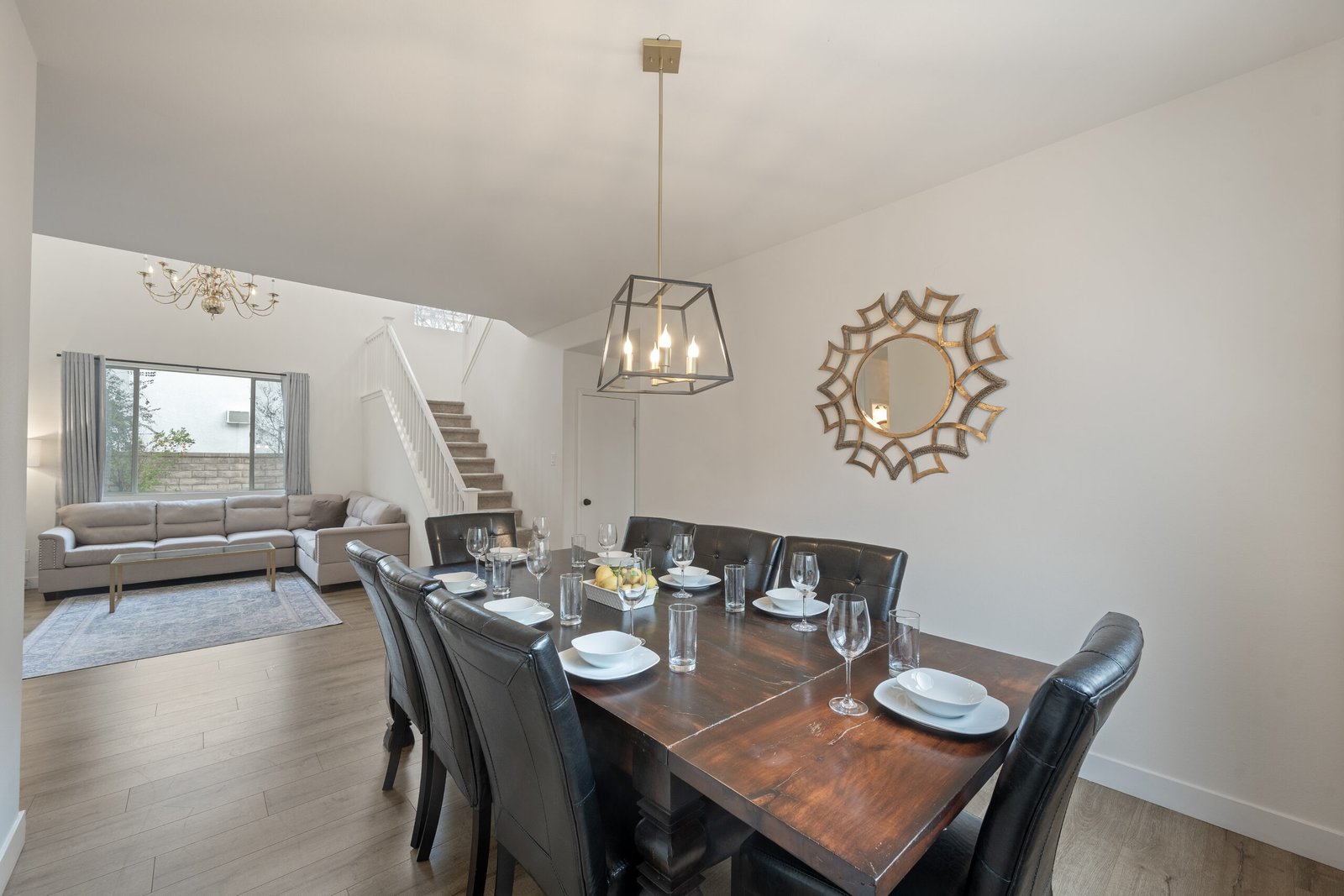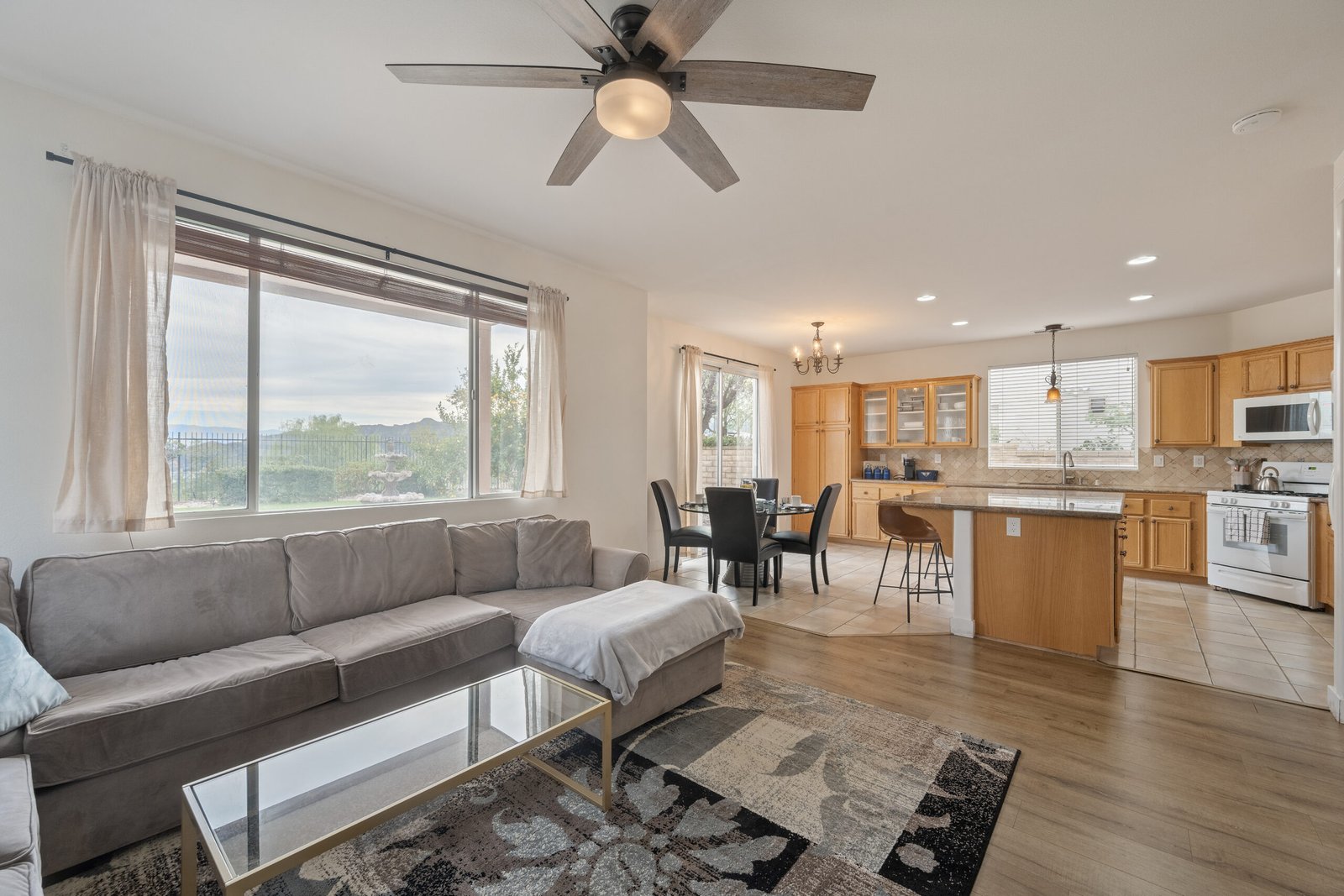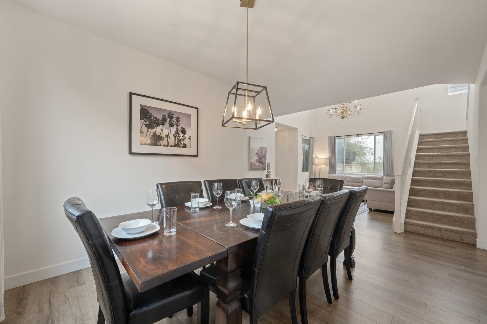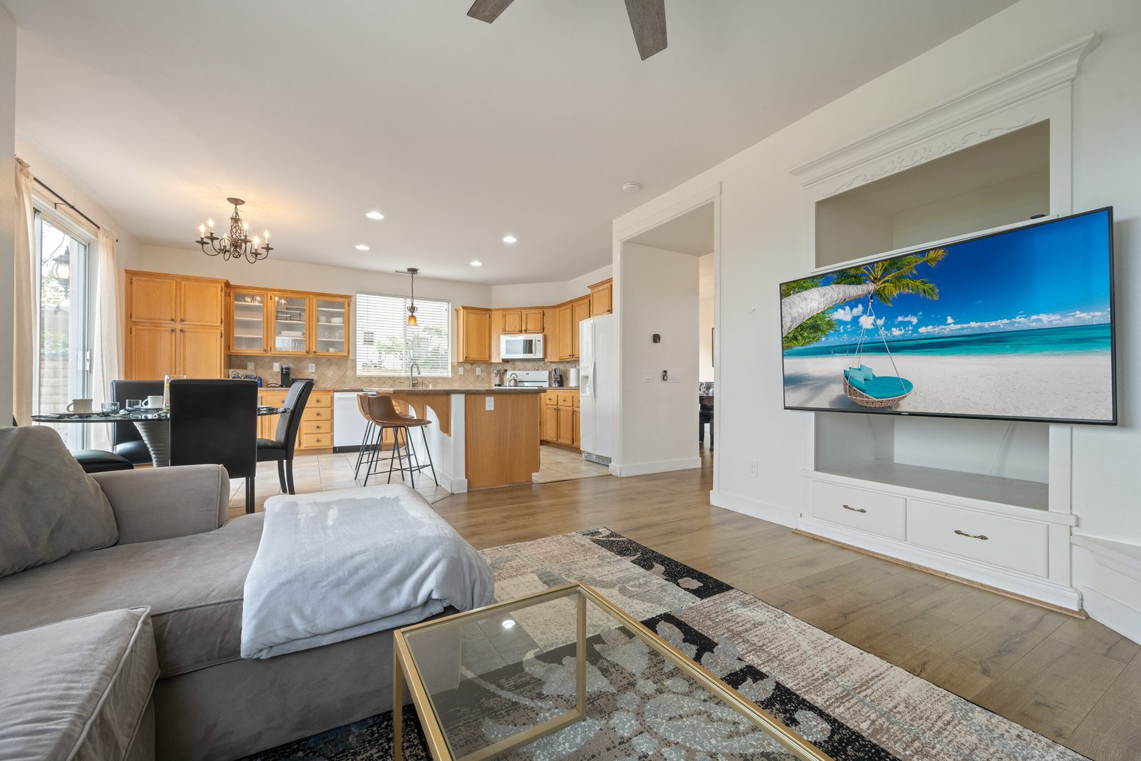 As you step inside, you’ll be greeted by a spacious open-concept living area that seamlessly blends comfort with style. The cozy living room features plush seating and a large flat-screen TV, perfect for family movie nights or catching up on your favorite shows after a day of exploration. The adjacent dining area comfortably seats eight, making it ideal for family dinners or game nights.