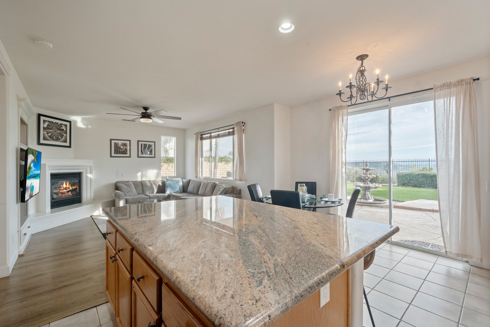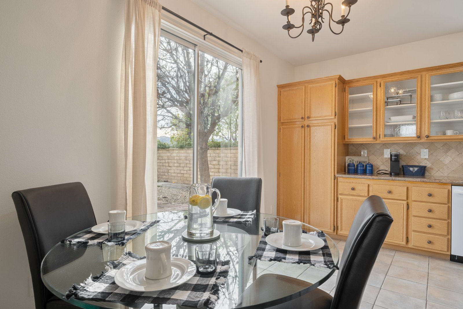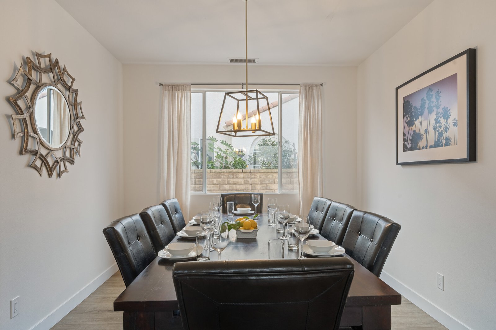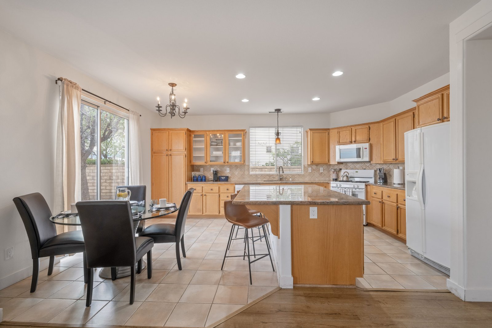 As you step inside, you’ll be greeted by a spacious open-concept living area that seamlessly blends comfort with style. The cozy living room features plush seating and a large flat-screen TV, perfect for family movie nights or catching up on your favorite shows after a day of exploration. The adjacent dining area comfortably seats eight, making it ideal for family dinners or game nights.